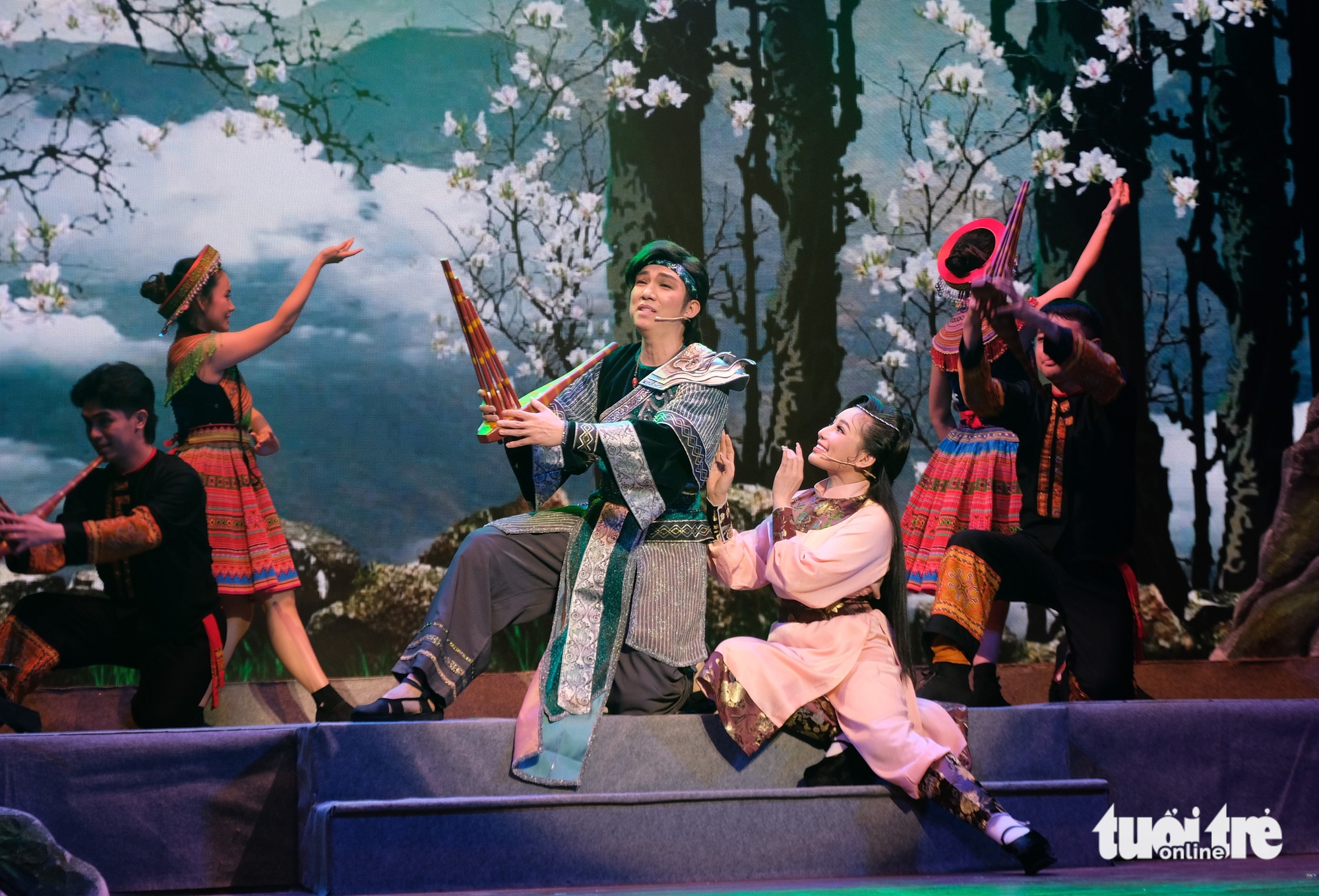 Vở cũng được làm mềm với cảnh sắc núi rừng Tây Bắc, những điệu múa, bài ca tạo nên sự lãng mạn trong cuộc gặp gỡ của nhân vật Thế Lộc và Ả Vân, tạo điều kiện cho Chuông vàng vọng cổ Minh Trường khoe giọng đẹp - Ảnh: LINH ĐOAN