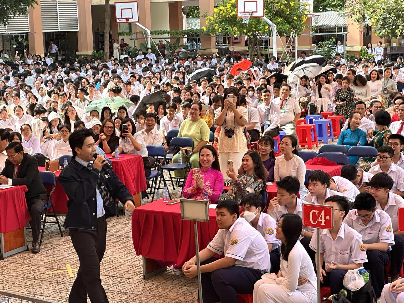 Ca sĩ Phạm Anh Tuấn nhận được sự cổ vũ nồng nhiệt của các thầy cô và học sinh trường THPT Nguyễn Chí Thanh sáng 20-4